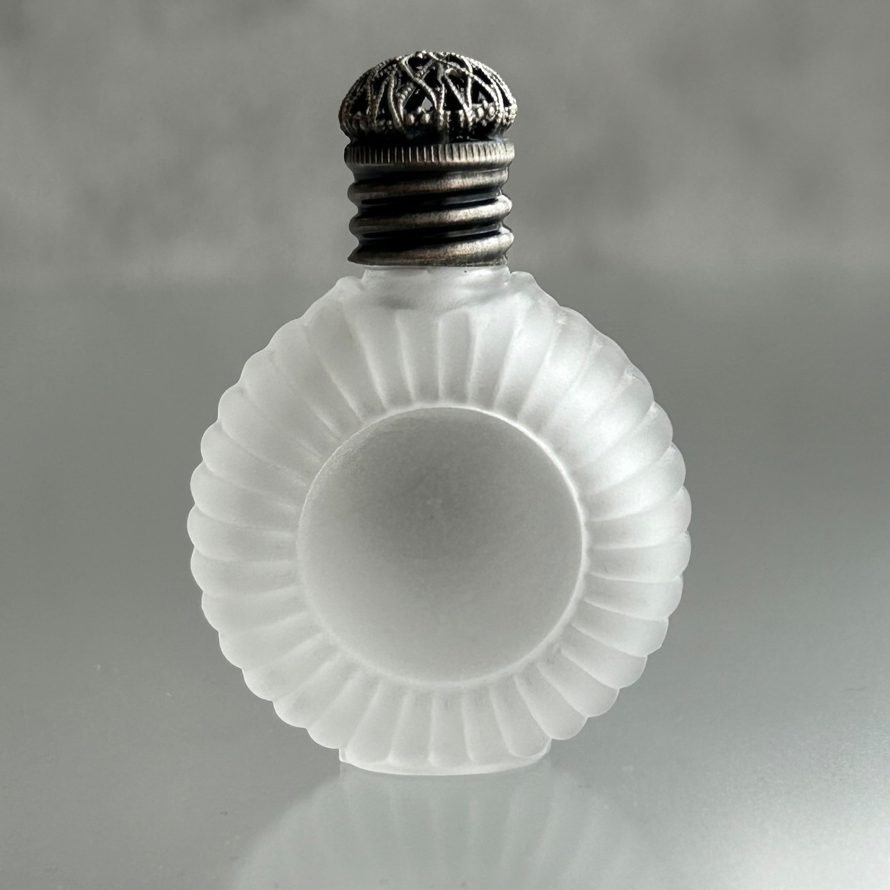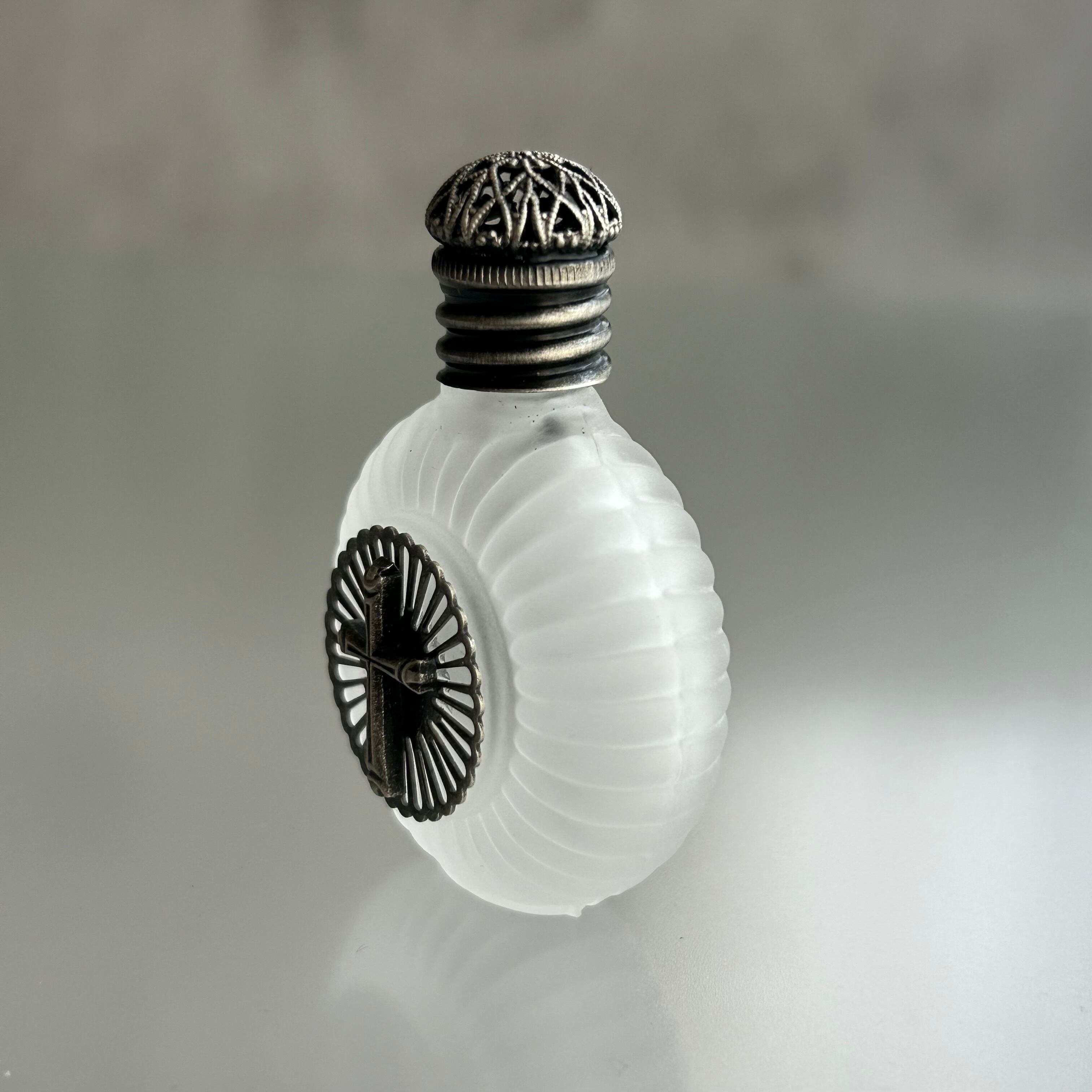【チェコ製】ボヘミアガラスの香水瓶(丸型 ホワイト クロス アンティークシルバー)