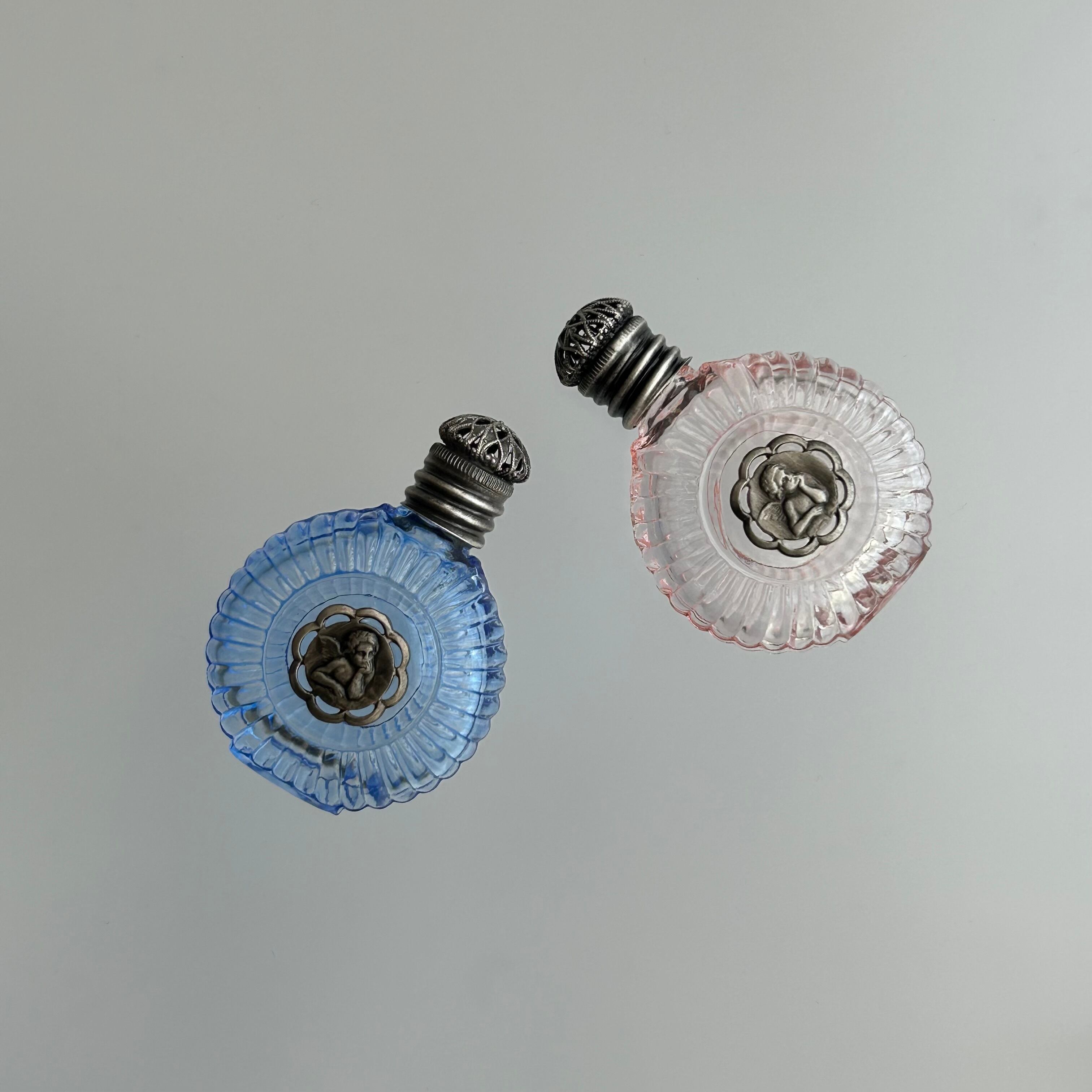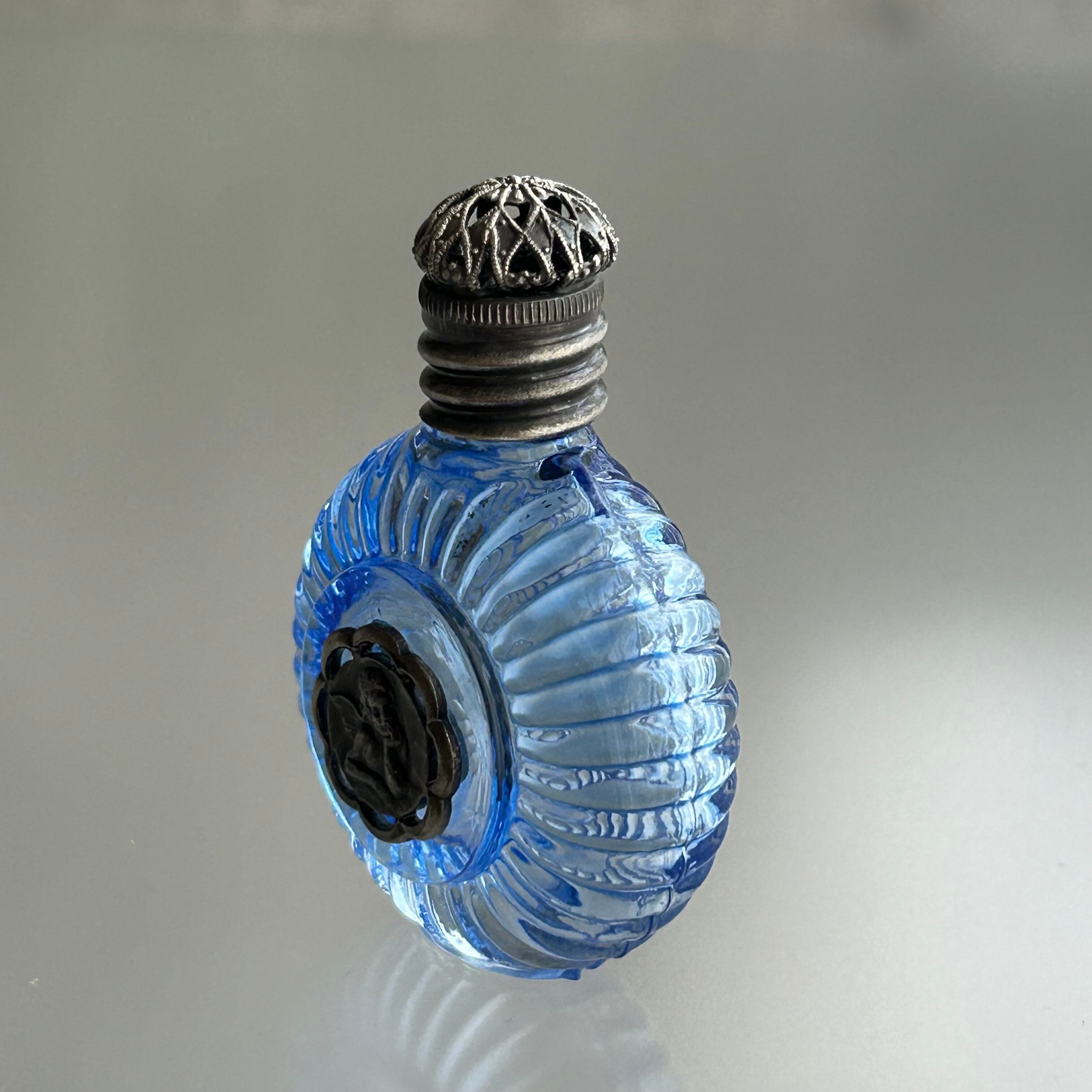 【チェコ製】ボヘミアガラスの香水瓶(丸型 ブルー エンジェル アンティークシルバー)