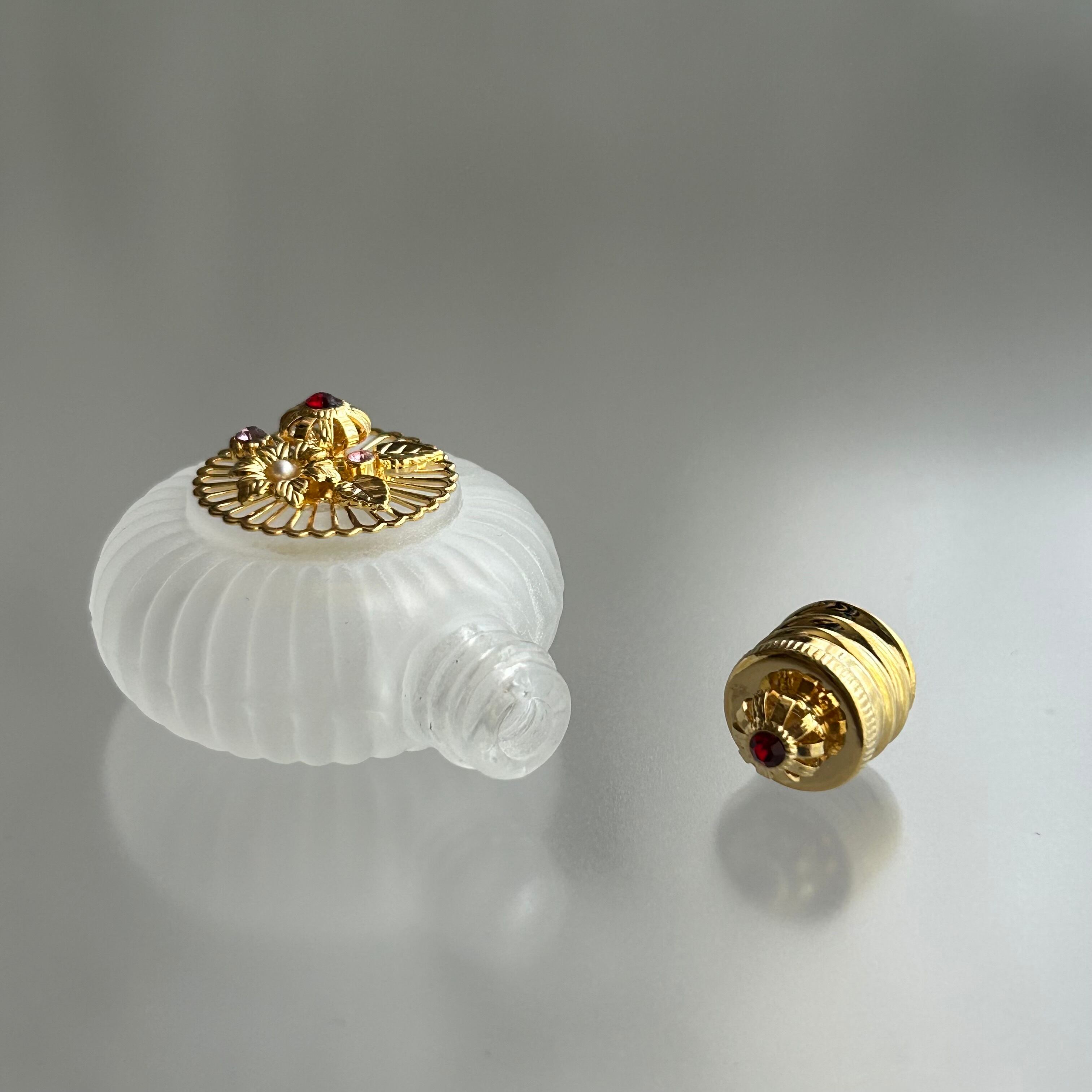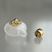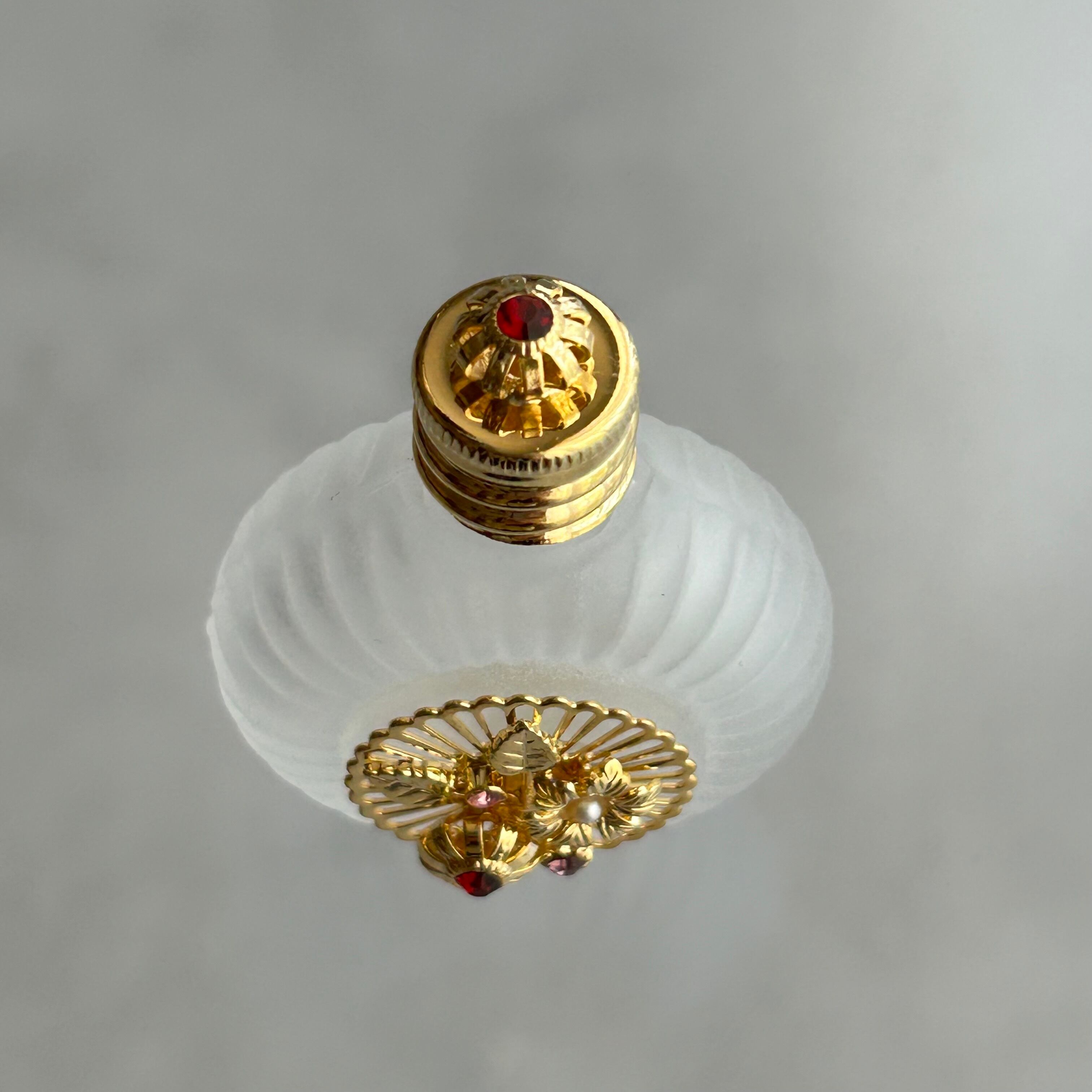 【チェコ製】ボヘミアガラスの香水瓶(丸型 ホワイト フラワー ゴールド)