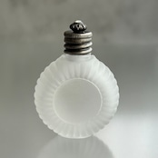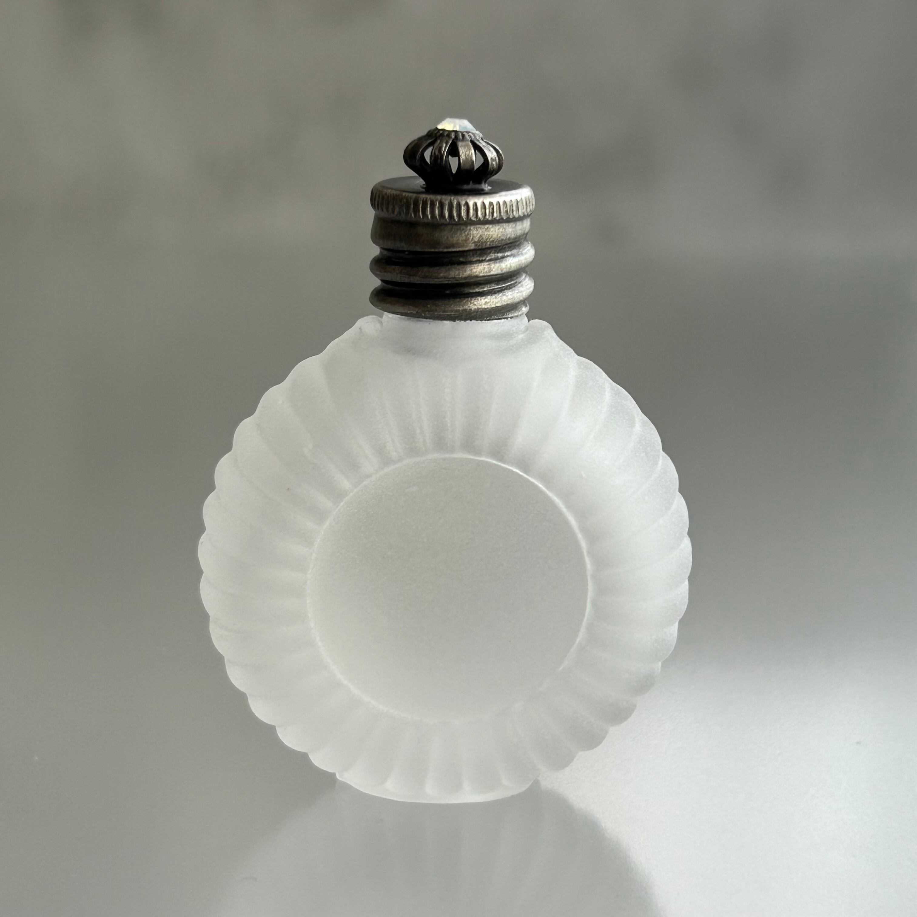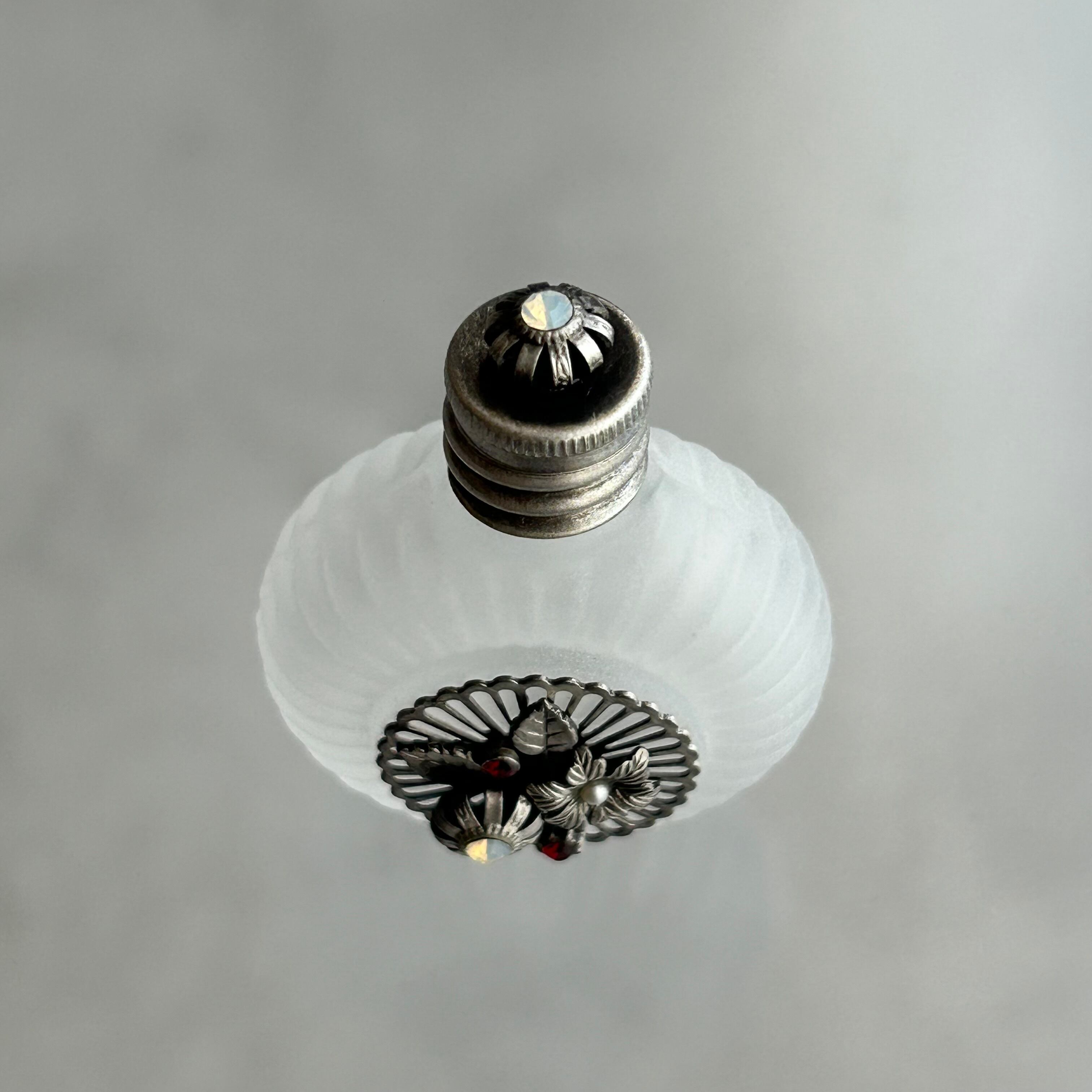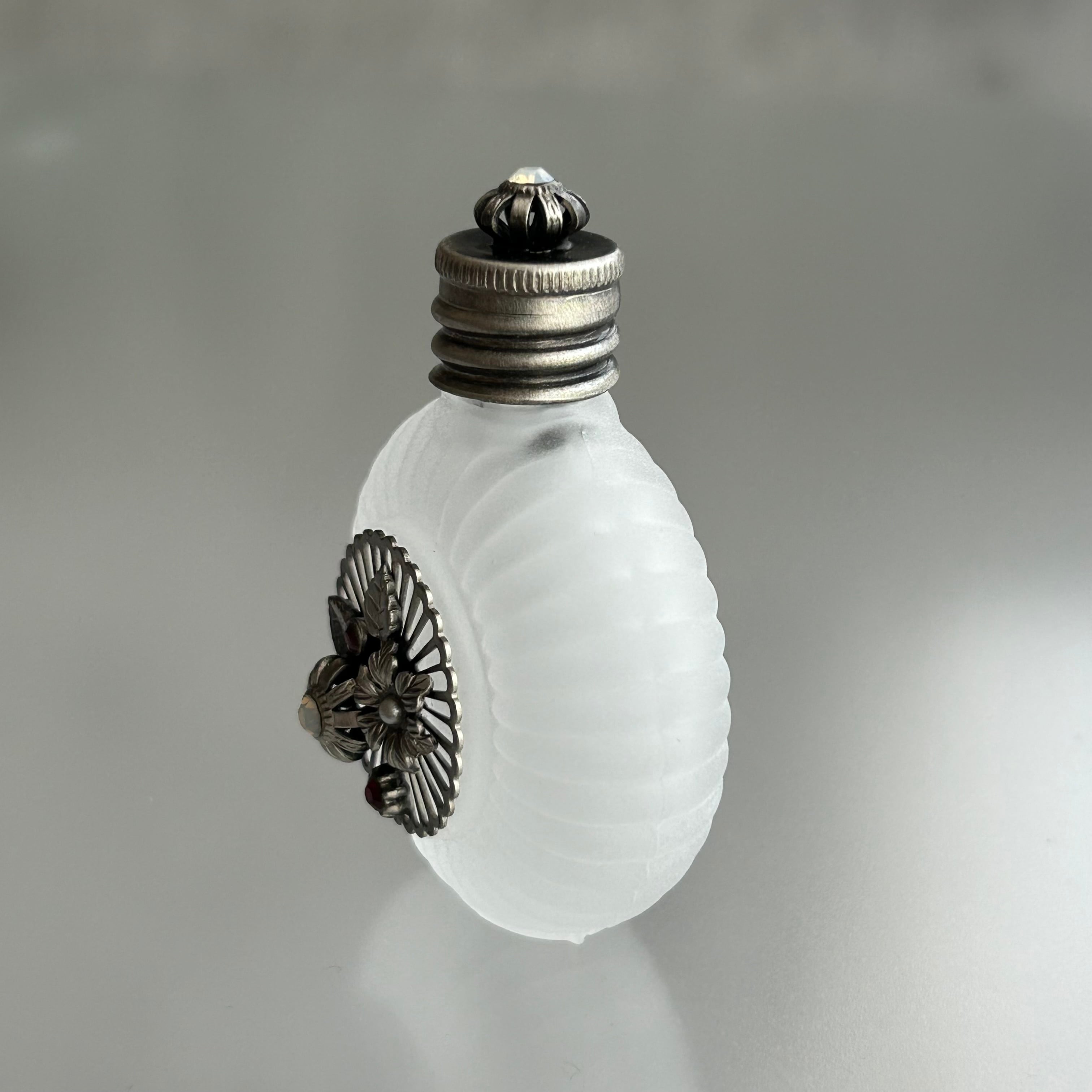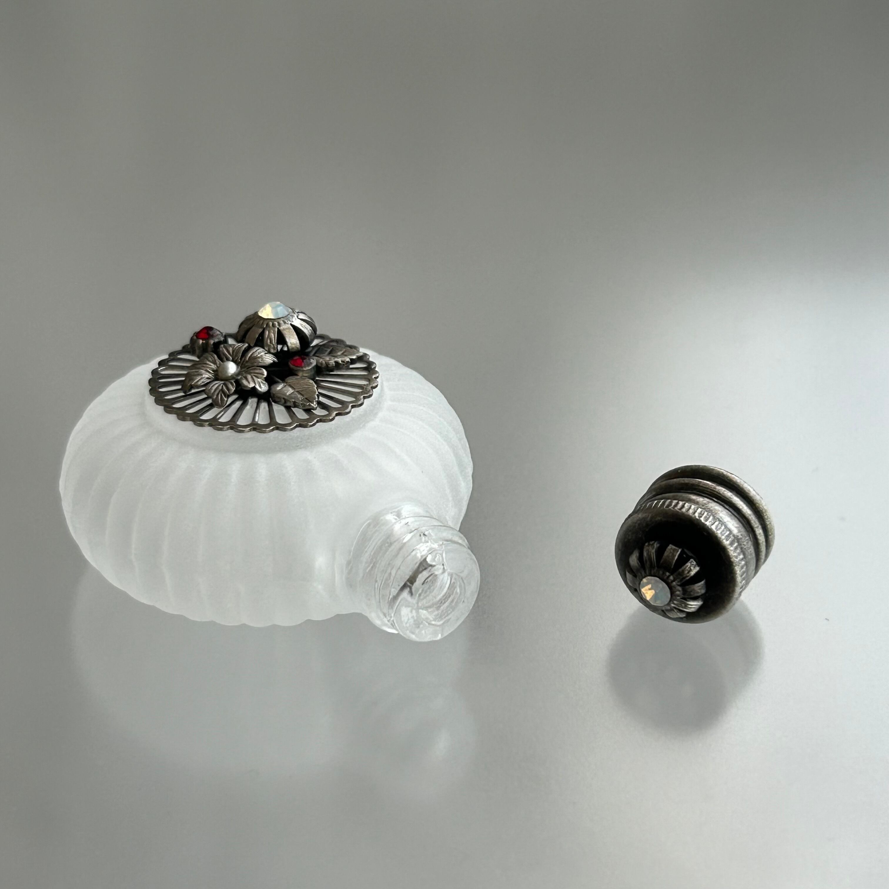 【チェコ製】ボヘミアガラスの香水瓶(丸型 ホワイト フラワー アンティークシルバー)