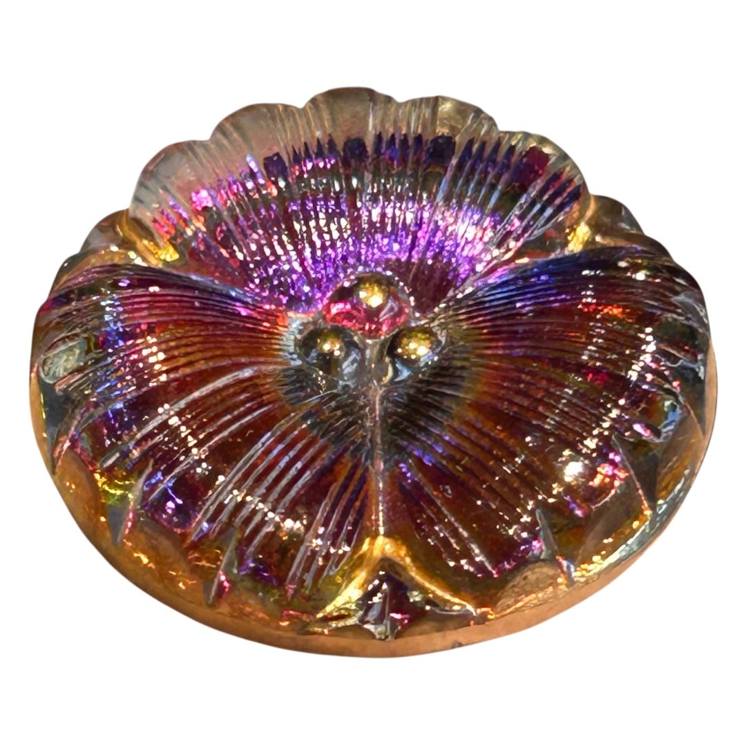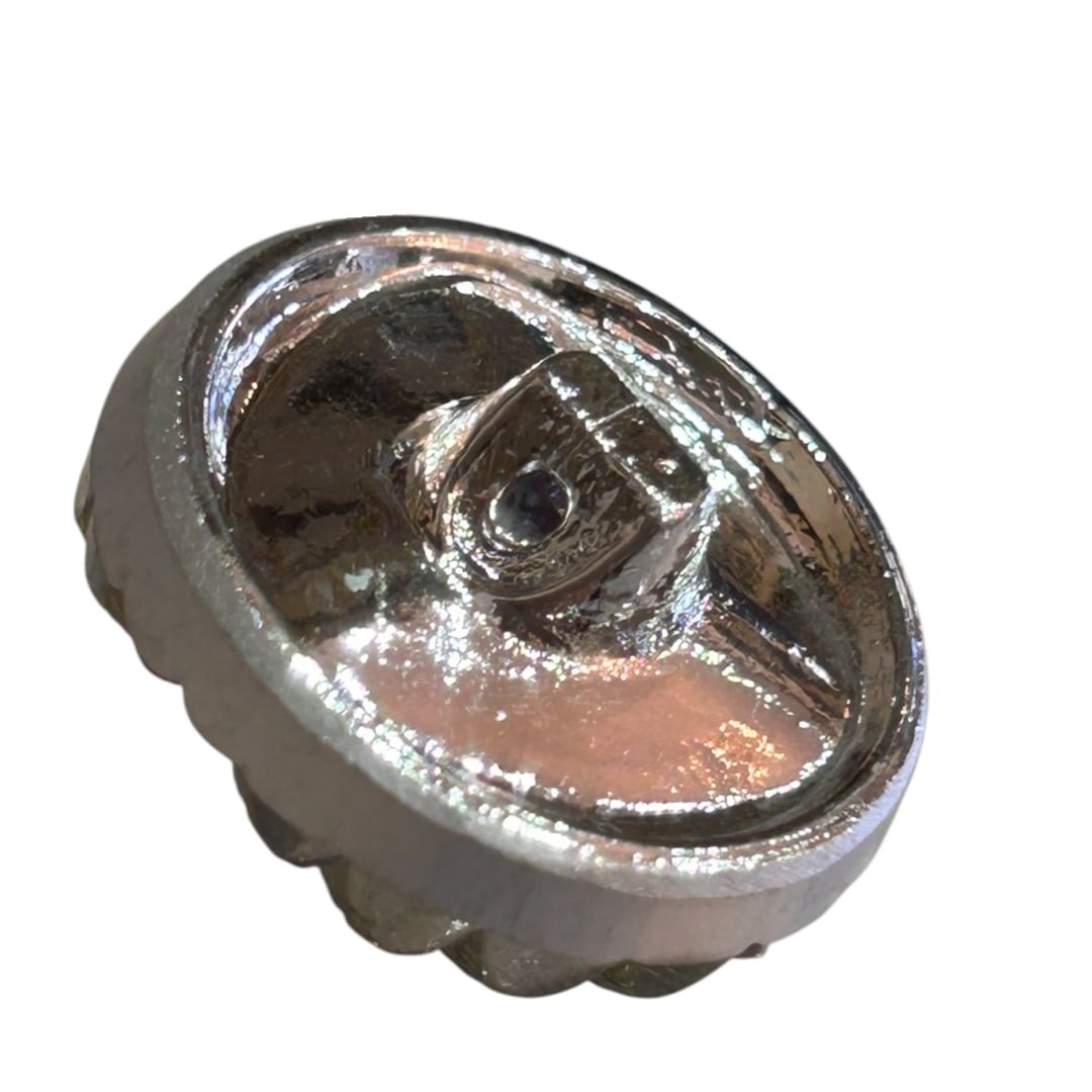 見る角度によって色彩が移ろい、まばゆく輝くガラスボタンです。