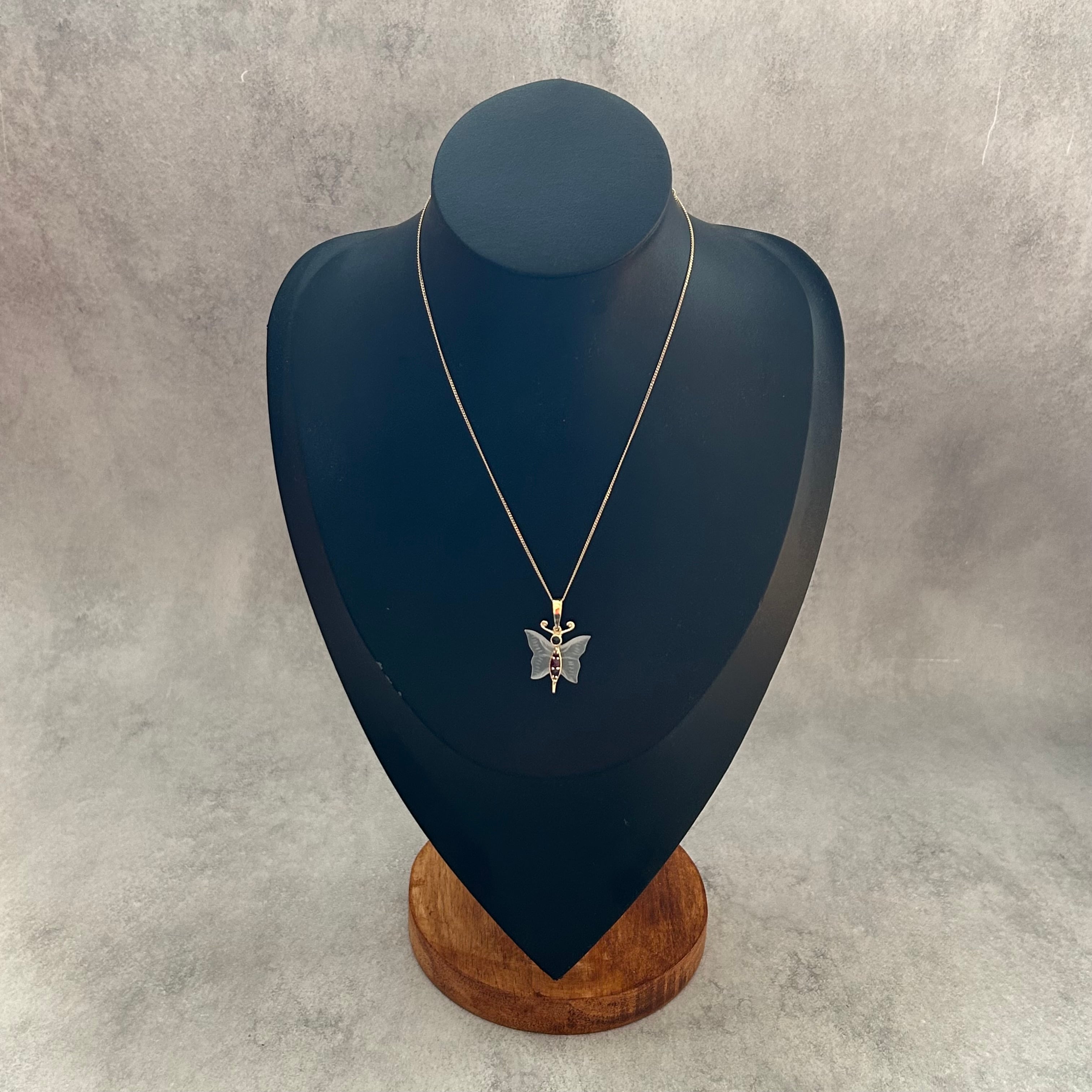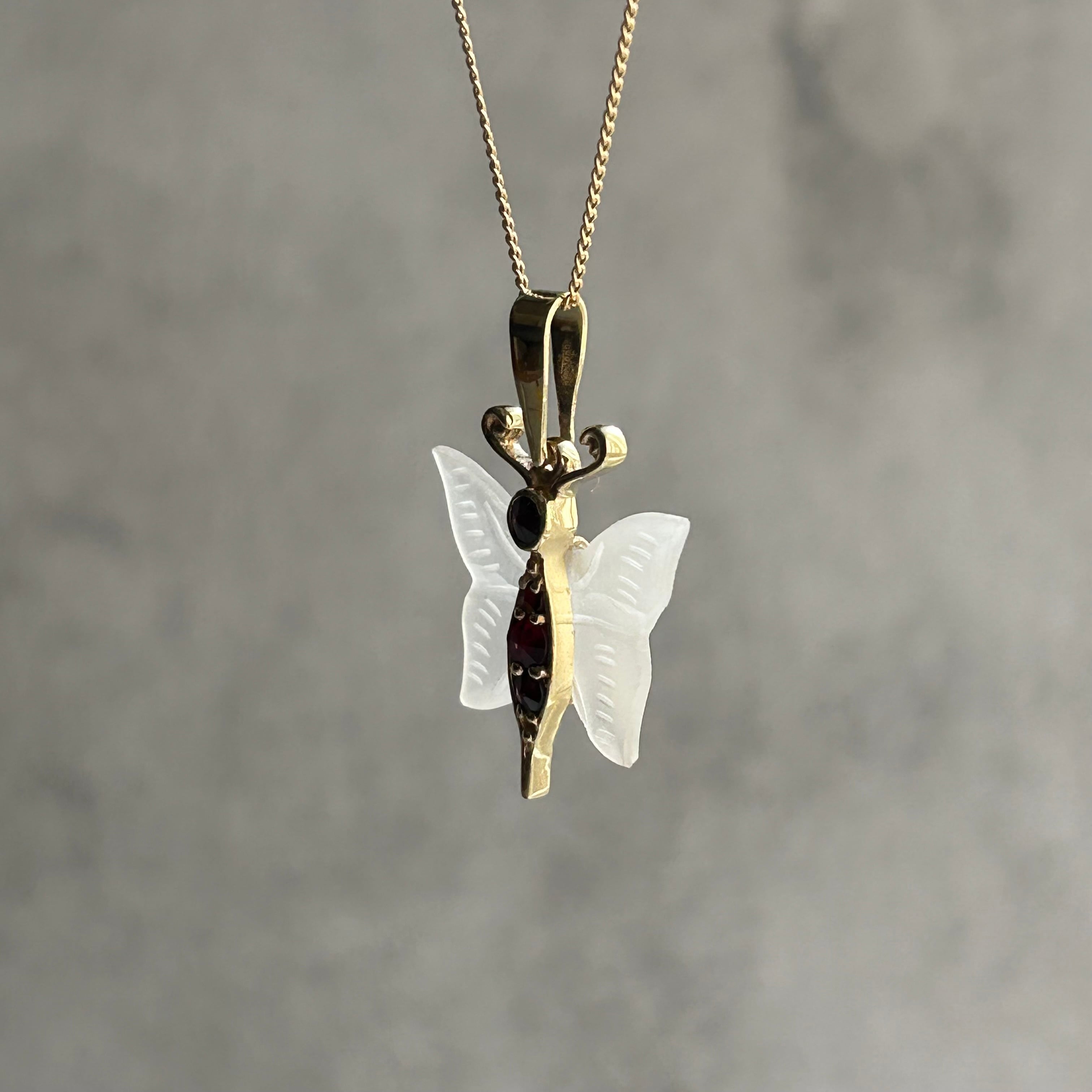 ガラスの羽根を持つ蝶々がモチーフのガーネットのペンダントトップ。