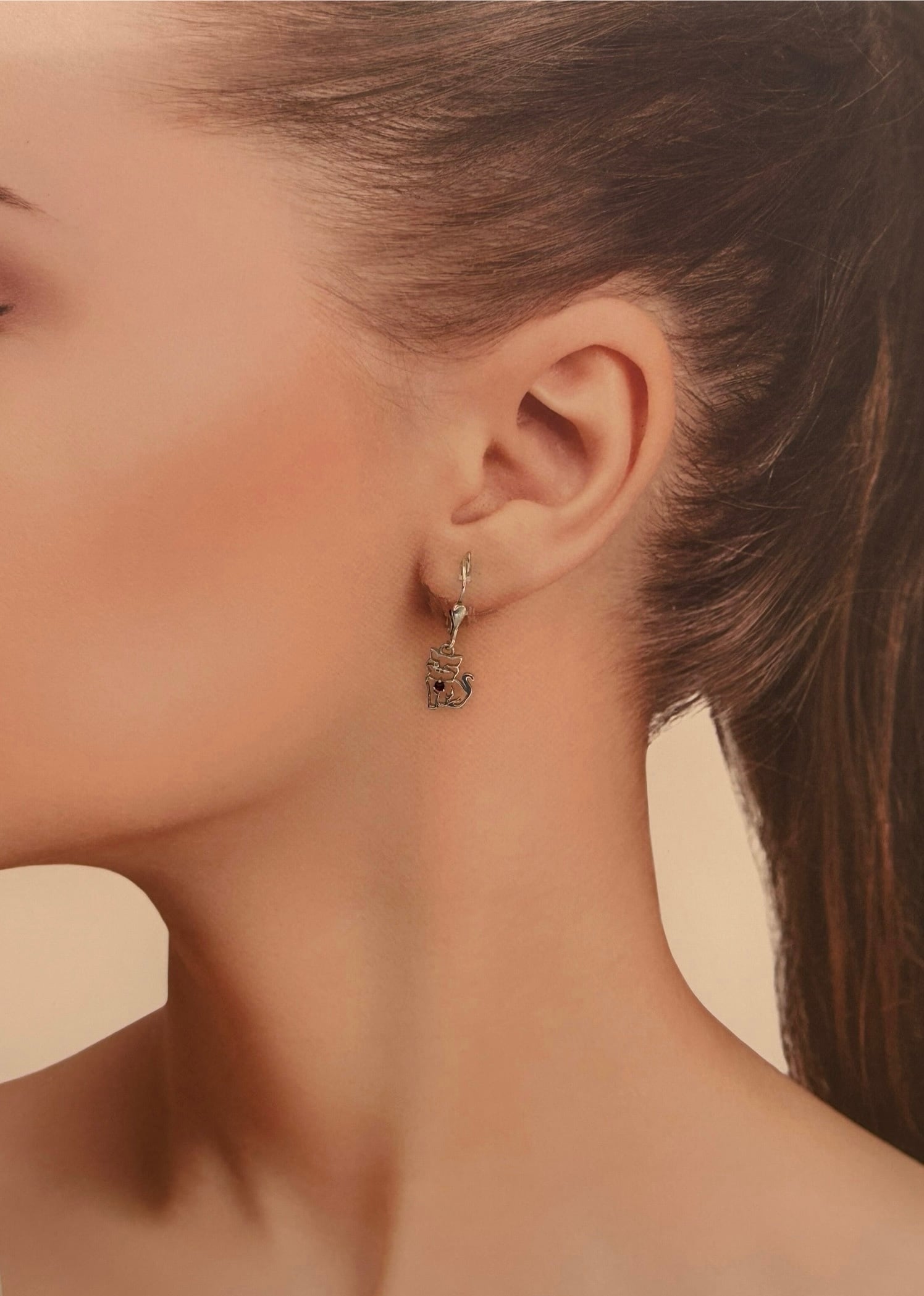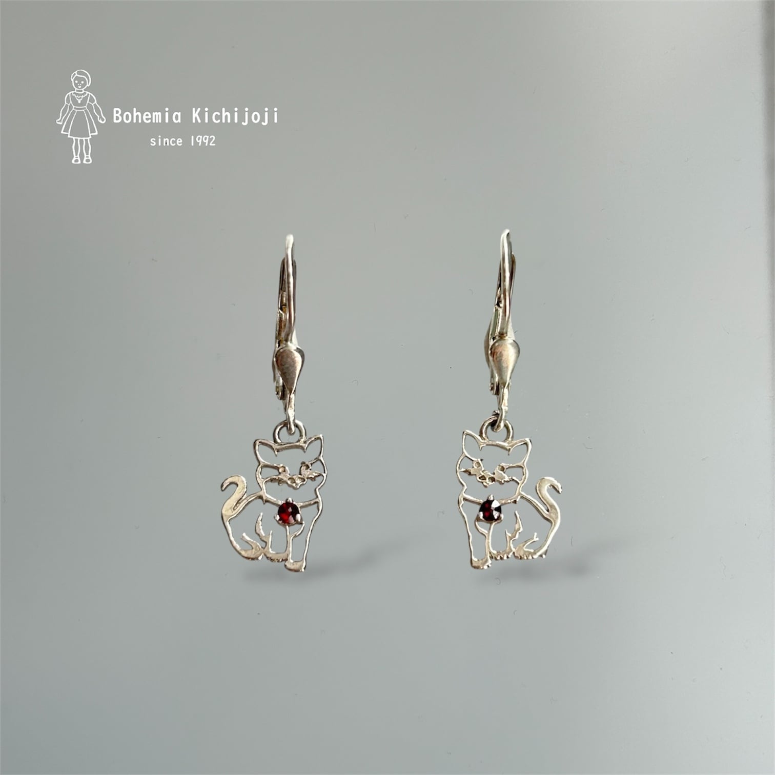 可愛らしい猫のピアス。丁寧にカットが施された一粒のガーネットがネコの首に輝いています。