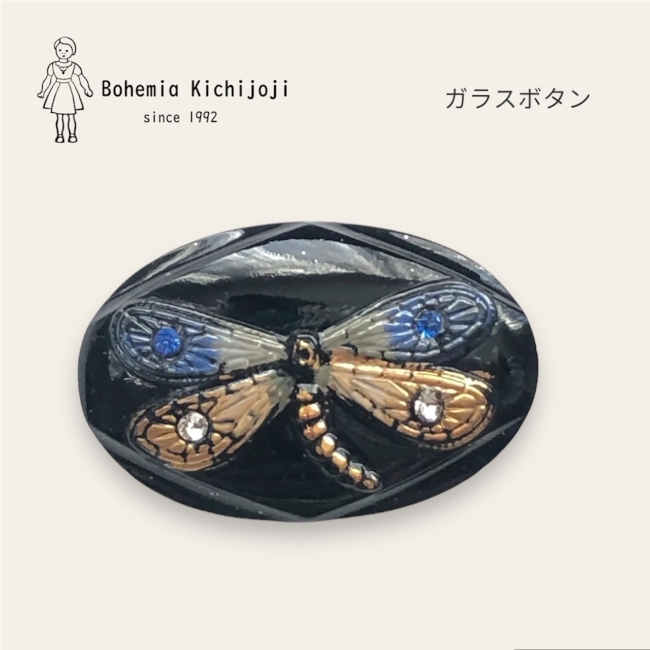 【チェコ ガラスボタン】トンボオーバル(ブラック パープル ゴールド ラインストーン付)