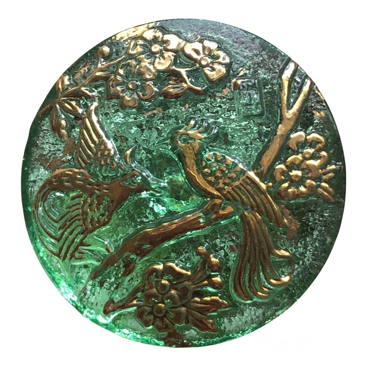 【チェコ ガラスボタン】オリエンタルバード(トランスペアレントグリーン ゴールド)12号