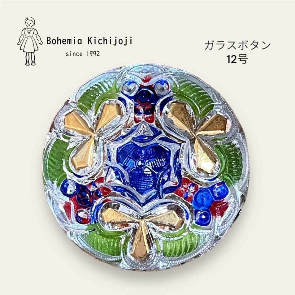 【チェコ ガラスボタン】ハッピークローバー(ブルー レッド グリーン ゴールド)12号