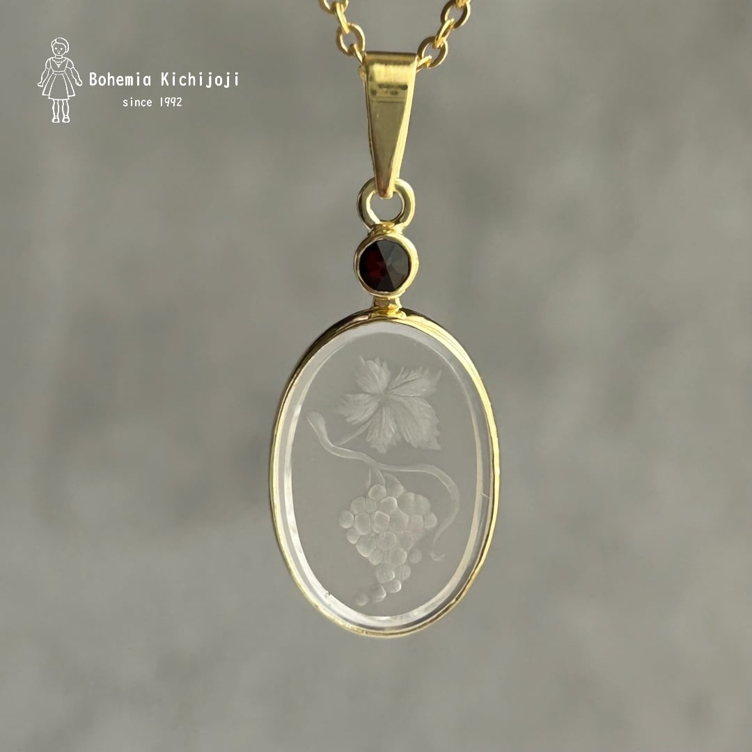 クリスタルガラスに繊細なブドウのエングレービングを施したペンダントトップ。一粒のガーネットがアクセントになっています。