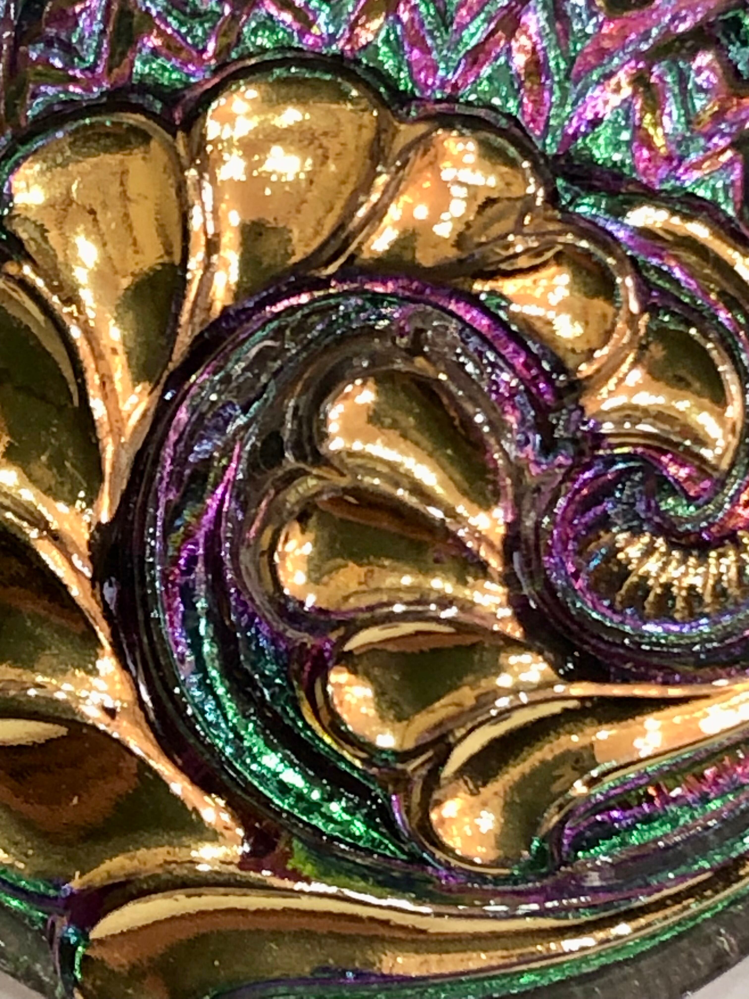 角度によって変化するグリーンとパープルの地色。金彩のアンモナイト風の模様。 透明感にあふれる一品。